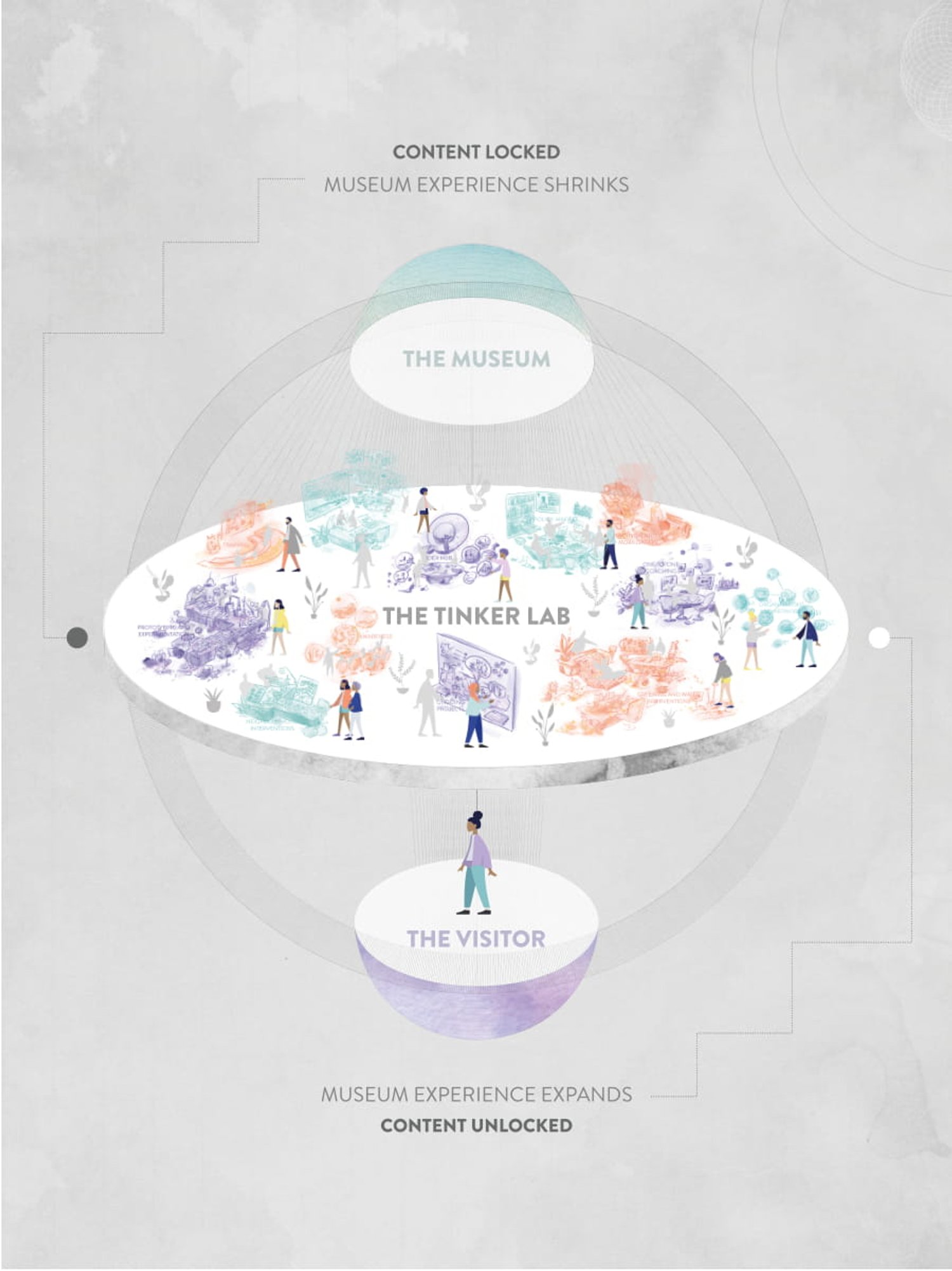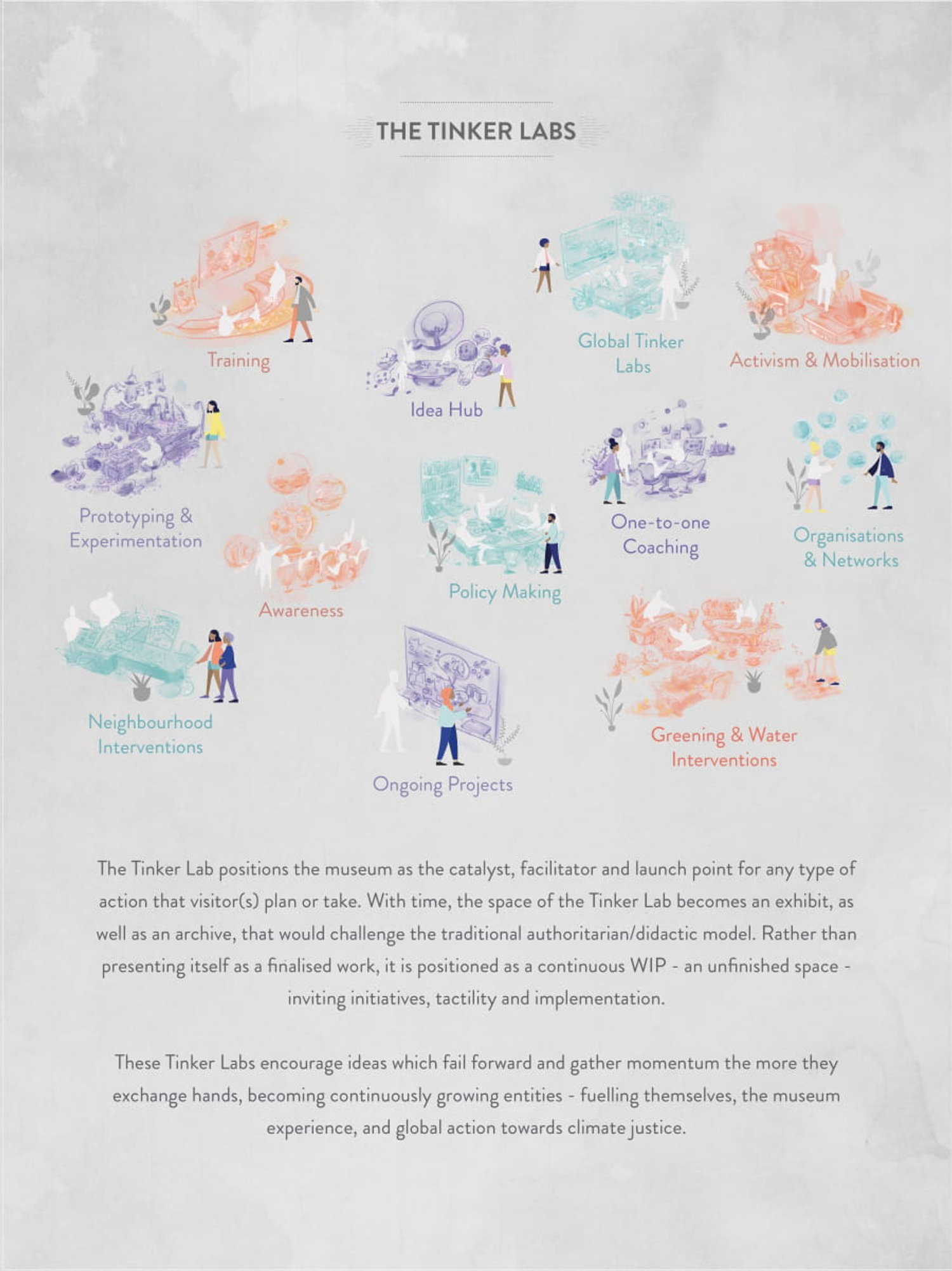 By acknowledging that they don’t have all the answers, but pledging to support those willing to engage in that search for them, museums move from being temples of knowledge and finality, towards becoming places for questions and action by adopting our retrofitted “symbiotic” model of Tinker Labs. Housed within the most publicly visible spaces and resourced by the museum, these Labs would empower visitors to experiment, and to rally the public towards collective localised action, hopefully creating cascading movements.