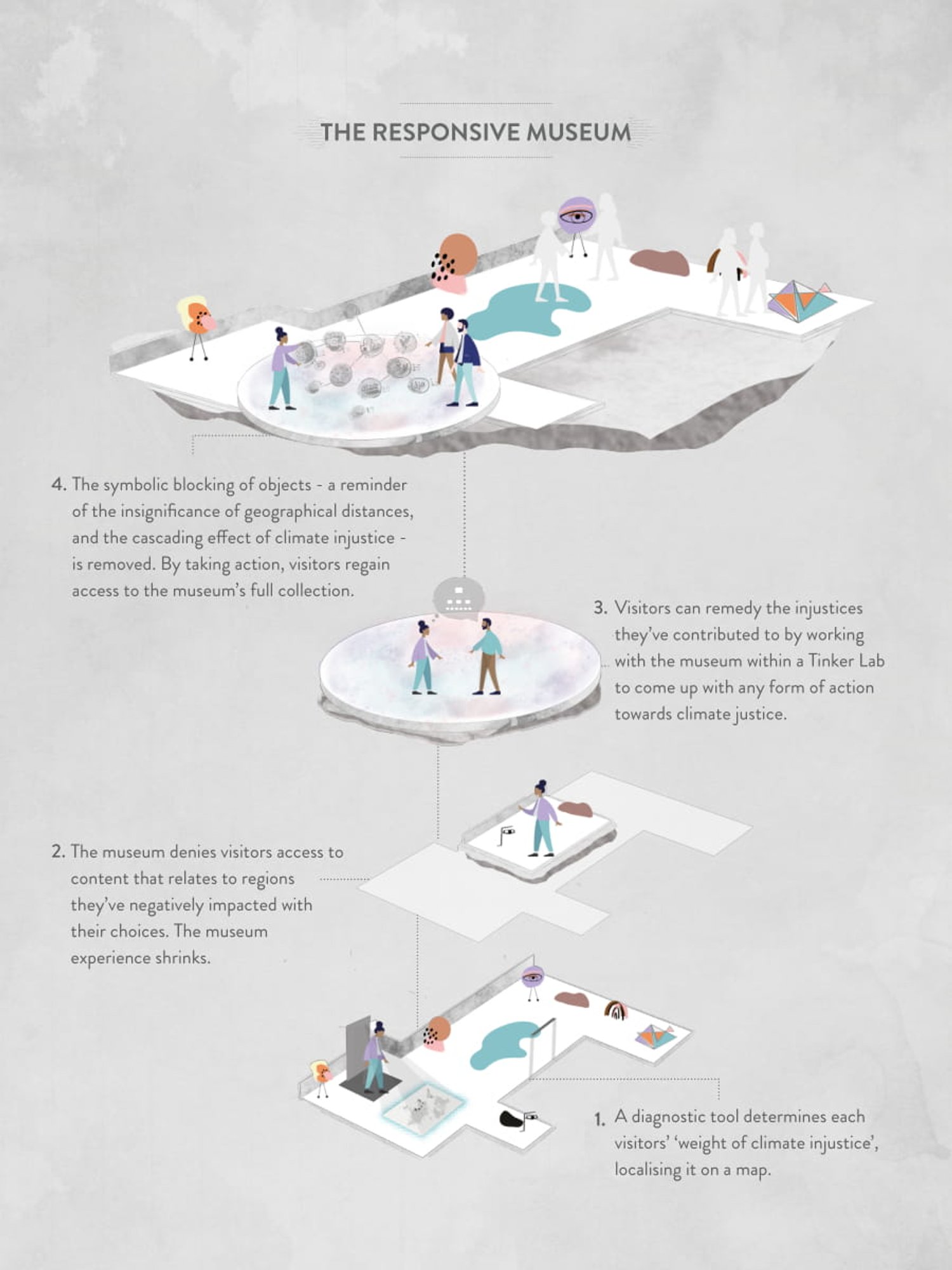 Consciously designed as a 10-year model, the Responsive Museum is an attempt to leverage the inherent influence and the existing plethora of resources accessible to museums, towards the climate movement, without creating more. The experience assesses each visitor’s ‘weight of climate injustice’, localising it on a map, and denying visitors access to any content related to areas that they might have negatively impacted with their choices. In order to unlock that content, visitors are prompted - and supported by - the museum in taking action towards climate justice.