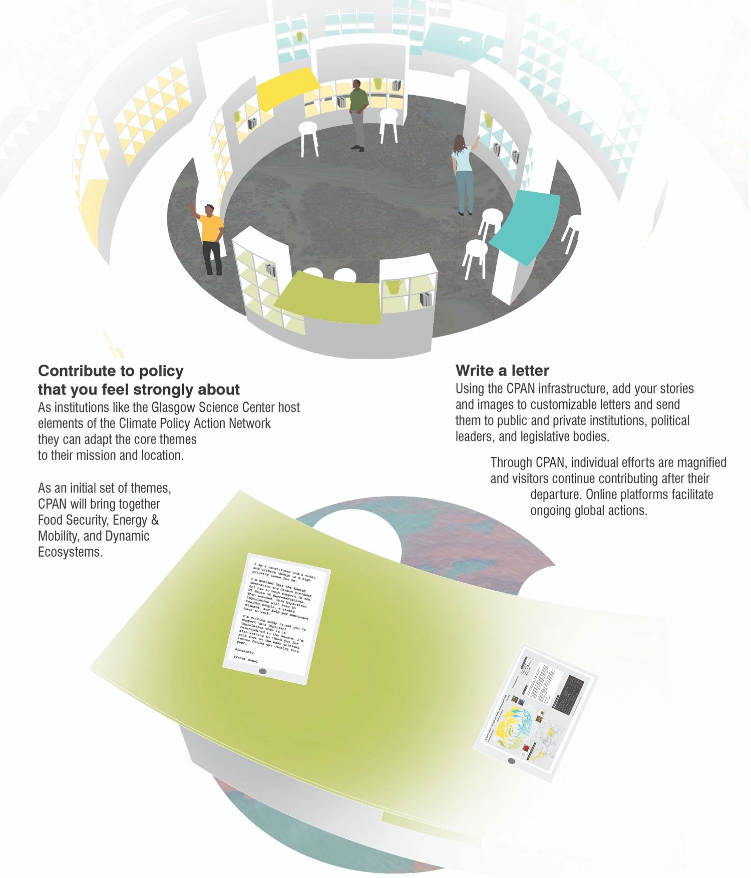 CPAN generates public thought on climate change and green futures, through user documentation and public policy across scales. This interactive museum experience is a place for publics to share materials and narratives. Through a two-pronged approach, visitors learn about the carbon footprint of contributed everyday objects; they can then take action, in the form of letter writing to the legislative bodies responsible for climate-related policies. Participants are empowered to recover from climate guilt and doomism, and emboldened to instigate change via this exchange of object-for-knowledge and knowledge-to-action.